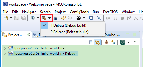 lpcxpresso55s69\_hello\_world\_sproject (TrustZone master project) in the Project Explorer. Then, choose the appropriate build target, Debug or Release, by clicking the downward facing arrow next to the hammer icon, as shown in Figure 3. For this example, select the Debug target.|