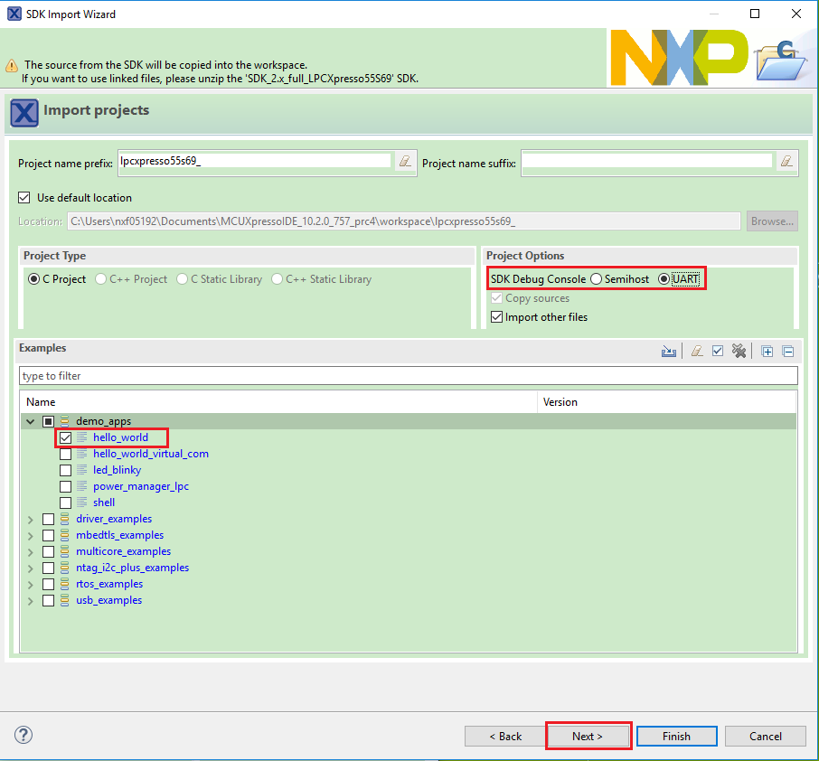 demo_appsfolder and selecthello_world. Then, select UART as SDK Debug Console andclick Next.|