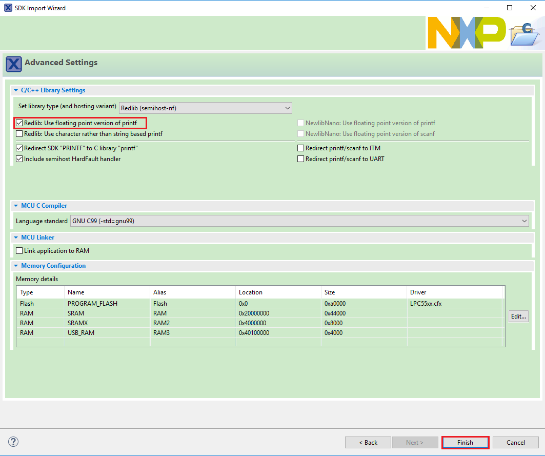 Ensure Redlib: Use floating-point version of printf is selected if the example prints floating-point numbers on the terminalfor demo applications such as
