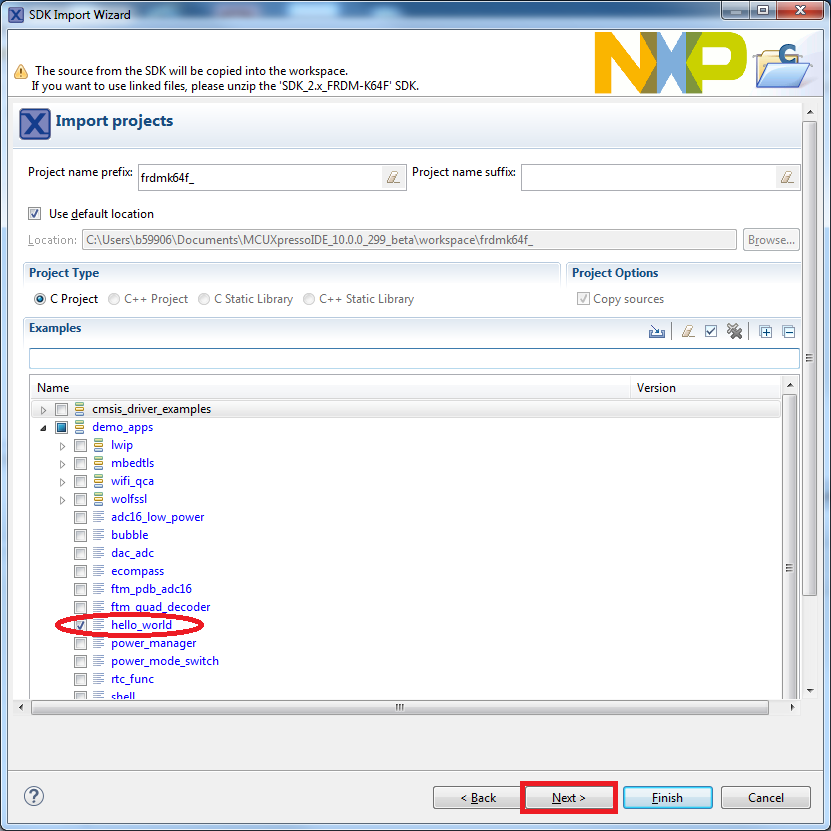 demo_appsfolder and selecthello_world. Then, select UART as SDK Debug Console andclick Next .