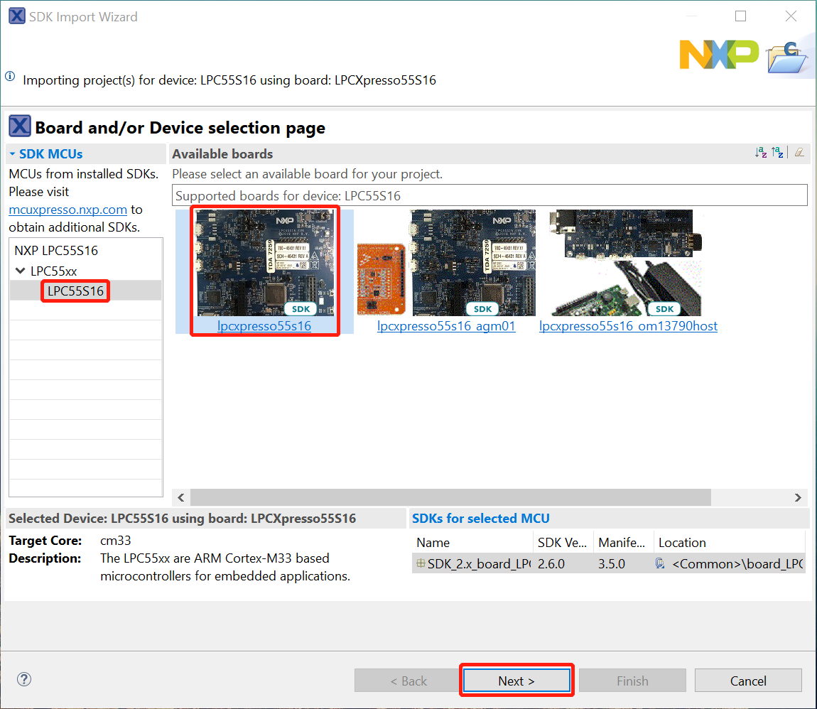 In the window that appears, expand the LPC55xx folder and select LPC55S16 . Then, select LPC55S16 and click Next.