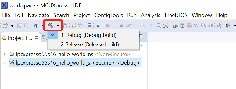 lpcxpresso55s16\_hello\_world\_sproject (TrustZone master project) in the Project Explorer. Then, choose the appropriate build target, Debug or Release, by clicking the downward facing arrow next to the hammer icon, as shown in Figure 3. For this example, select the Debug target.