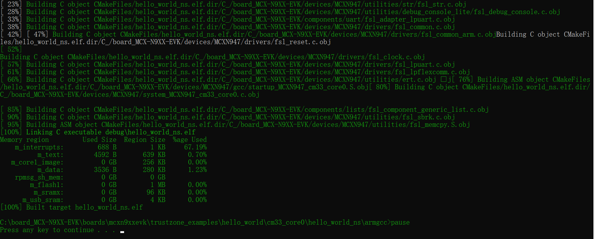 Build both applications separately, following steps for single core examples as described in Build an example application. It is requested to build the application for the secure project first, because the non-secure project needs to know the secure project, since CMSE library is running the linker. It is not possible to finish the non-secure project linker with the secure project because the CMSE library is not ready.