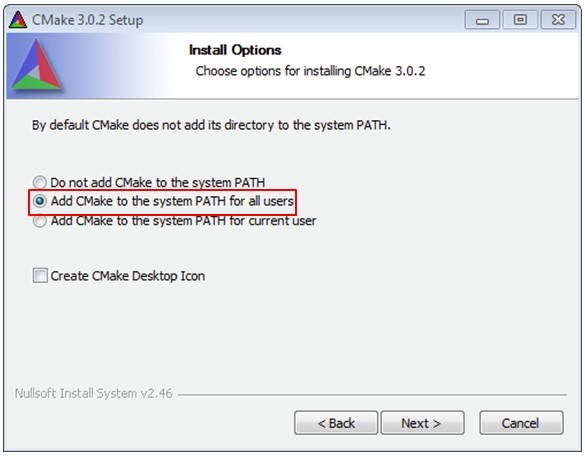 Install CMake, ensuring that the option Add CMake to system PATH is selected when installing. The user chooses to select whether it is installed into the PATH for all users or just the current user. In this example, it is installed for all users.