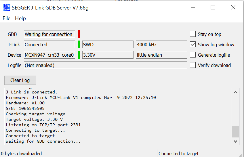 Open the J-Link GDB Server application. Assuming the J-Link software is installed, the application can be launched by going to the Windows operating system Start menu and selecting Programs -> SEGGER -> J-Link <version> J-Link GDB Server.