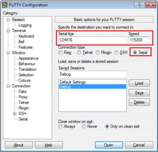 Open the terminal application on the PC, such as PuTTY or TeraTerm, and connect to the debug serial port number (to determine the COM port number, see How to determine com port.