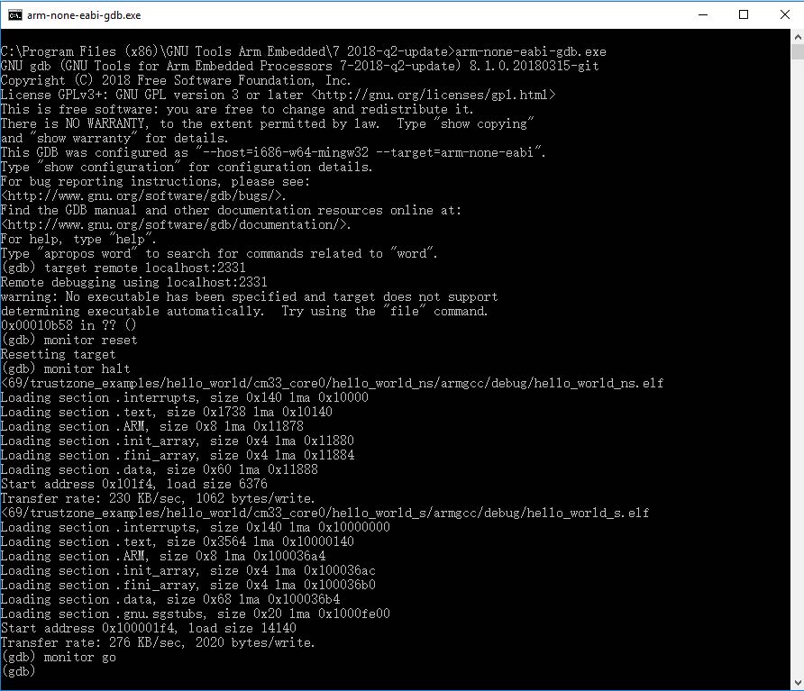 arm-none-eabi-gdb.exetarget remote localhost:2331monitor resetmonitor haltload <install_dir>/boards/mcxn9xxevk/trustzone_examples/hello_world/cm33_core0/hello_world_ns/armgcc/debug/hello_world_ns.elfload <install_dir>/boards/mcxn9xxevk/trustzone_examples/hello_world/cm33_core0/hello_world_s/armgcc/debug/hello_world_s.elfThe application is now downloaded and halted at the watch point. Execute the