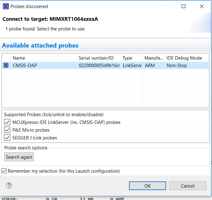 The first time you debug a project, the Debug Emulator Selection Dialog is displayed, showing all supported probes that are attached to your computer. Select the probe through which you want to debug and click OK. (For any future debug sessions, the stored probe selection is automatically used, unless the probe cannot be found.)