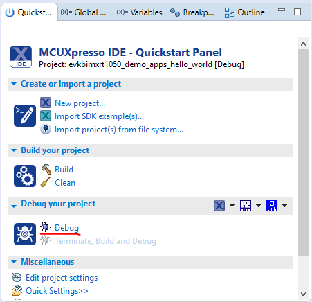 On the Quickstart Panel, click Debug evkbimxrt1050_demo_apps_hello_world [Debug].