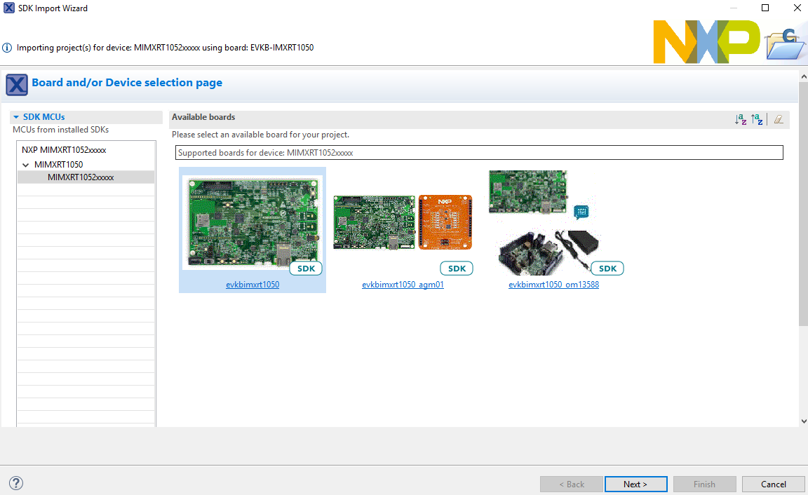 In the window that appears, expand the MIMXRT1050 folder and select MIMXRT1052xxxxx. Then, select evkbimxrt1050 and click Next, as shown in Figure 3.
