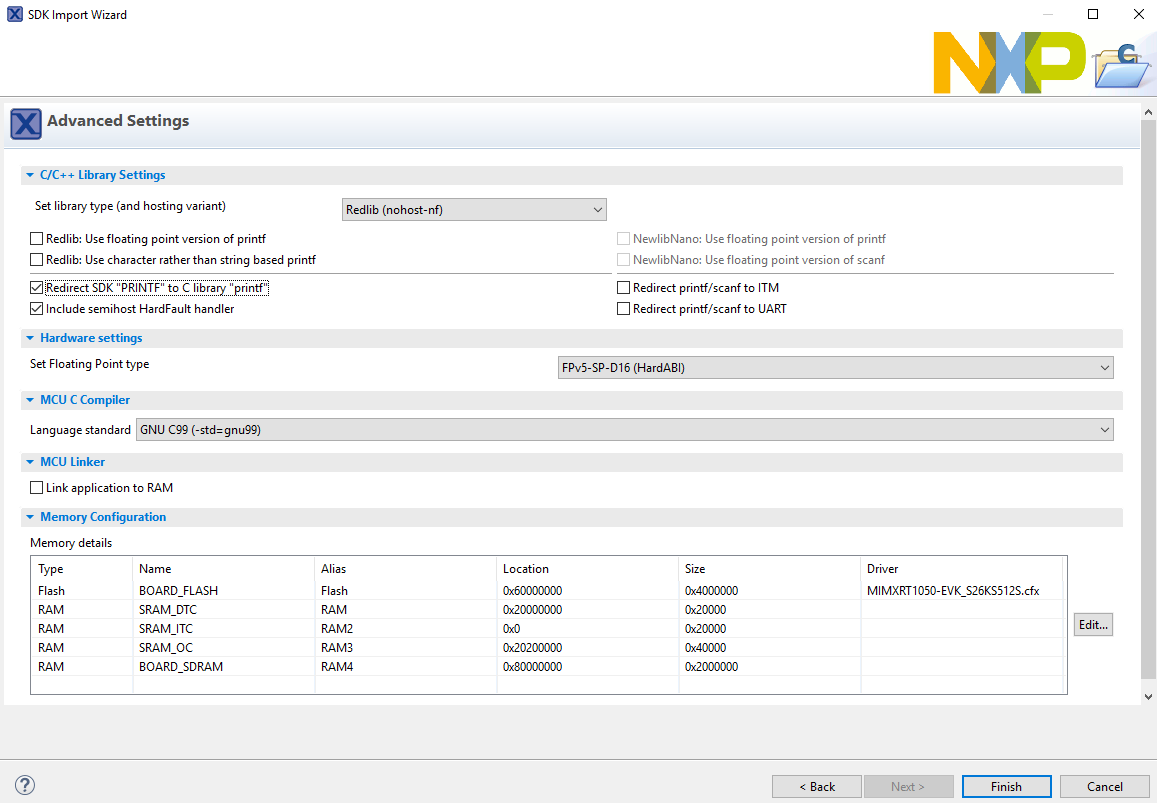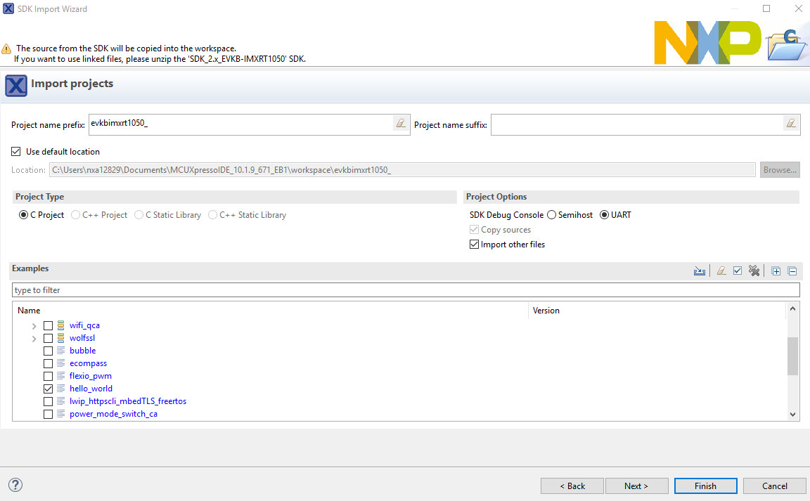 dac32_adc12,dac_adc,dac_cadc,ecompass,sai,coremark,mbedtls_benchmark,wolfssl_benchmark, and formmcau_examplessuch asmmcau_api). Otherwise, there is no need to select it. Click Finish.