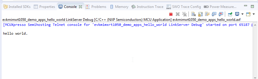 This section describes the steps required to configure MCUXpresso IDE to build, run, and debug example applications. The hello_world demo application targeted for the IMXRT1050-EVKB platform is used as an example, though these steps can be applied to any example application in the MCUXpresso SDK.