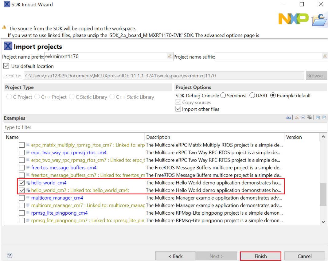 This section describes the steps required to configure MCUXpresso IDE to build, run, and debug example applications. The hello_world demo application targeted for the MIMXRT1170-EVKB hardware platform is used as an example, though these steps can be applied to any example application in the MCUXpresso SDK.