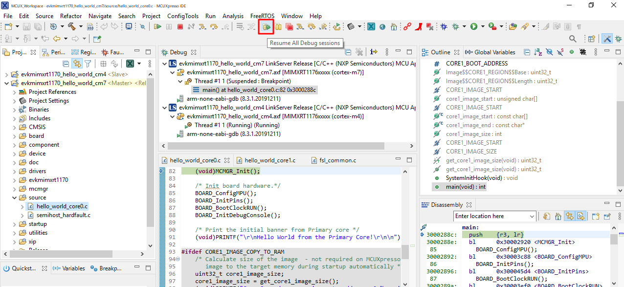 This section describes the steps required to configure MCUXpresso IDE to build, run, and debug multicore example applications. The following steps can be applied to any multicore example application in the MCUXpresso SDK. Here, the dual-core version of hello_world example application targeted for the evkbmimxrt1170 hardware platform is used as an example.