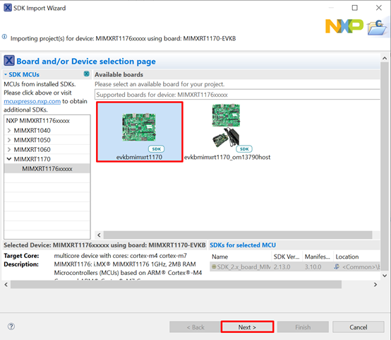 In the window that appears, select MIMXRT1176xxxxx. Then, select evkbmimxrt1170 and click Next.