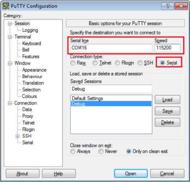 Open the terminal application on the PC, such as PuTTY or TeraTerm, J11 on EVKB, and connect to the debug serial port number. To determine the COM port number, see How to determine COM port. Configure the terminal with these settings: