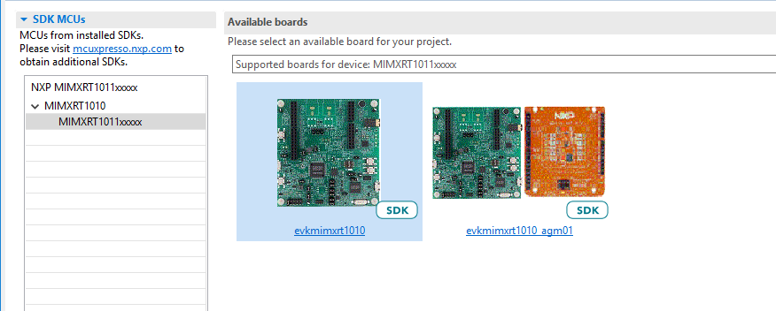 In the window that appears, expand the MIMXRT1011 folder and select MIMXRT1011xxxxx. Then, select evkmimxrt1010 and click Next, as shown in Figure 3.