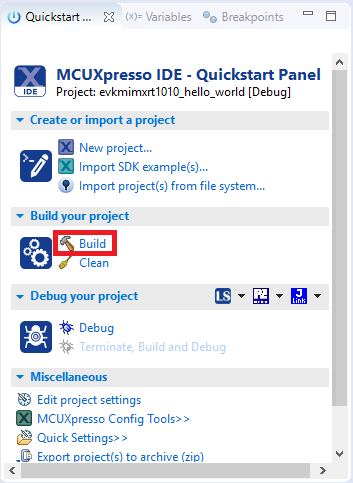 On the Quickstart Panel, click Debug evkmimxrt1015_demo_apps_hello_world [Debug].