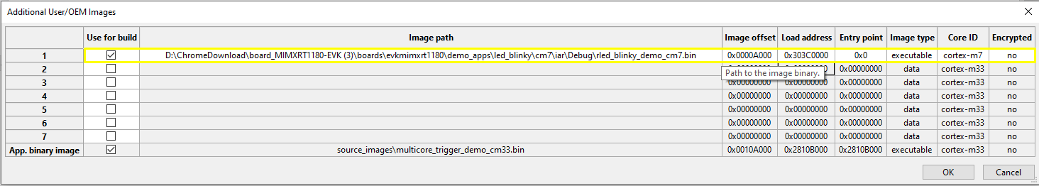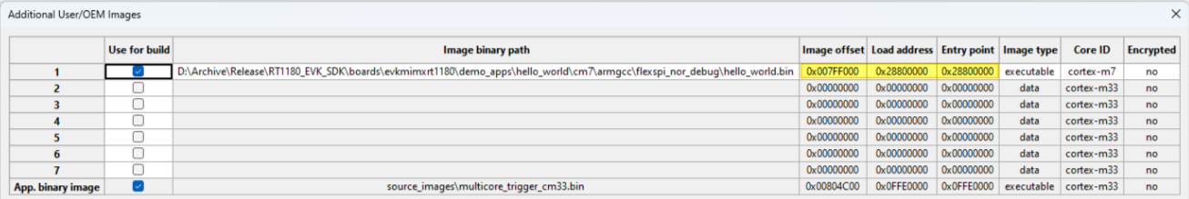 For a secure provisioning tool to generate such a bootable CM7 image, specify the CM33 multicore_trigger image in Source executable image. The CM7 application image to be kicked off must be specified with additional images.
