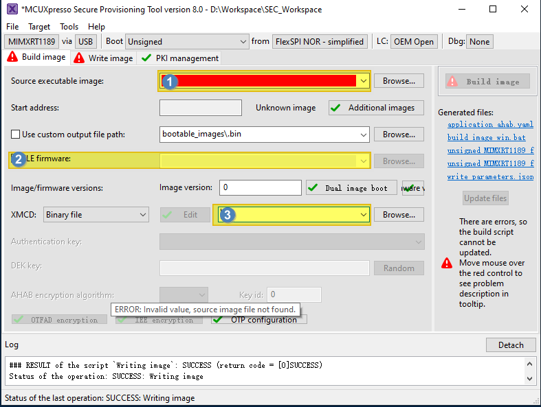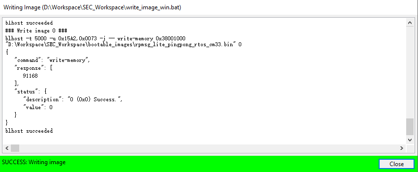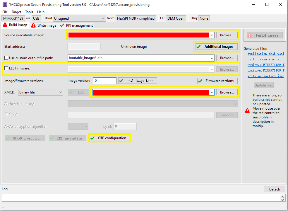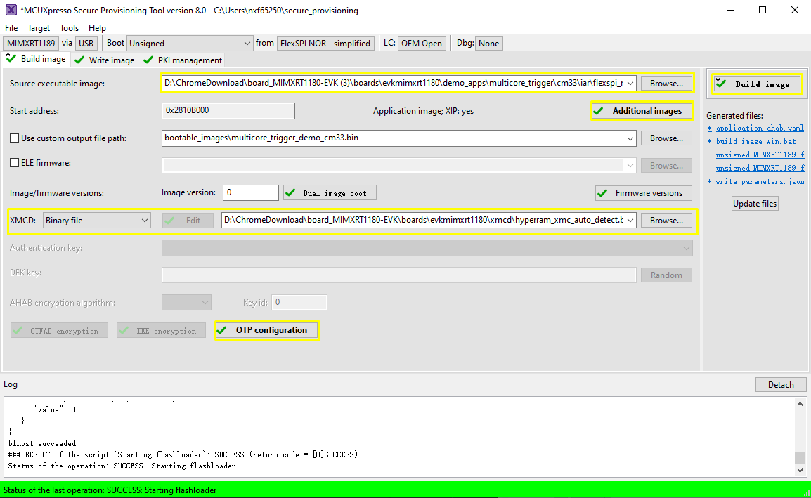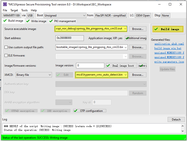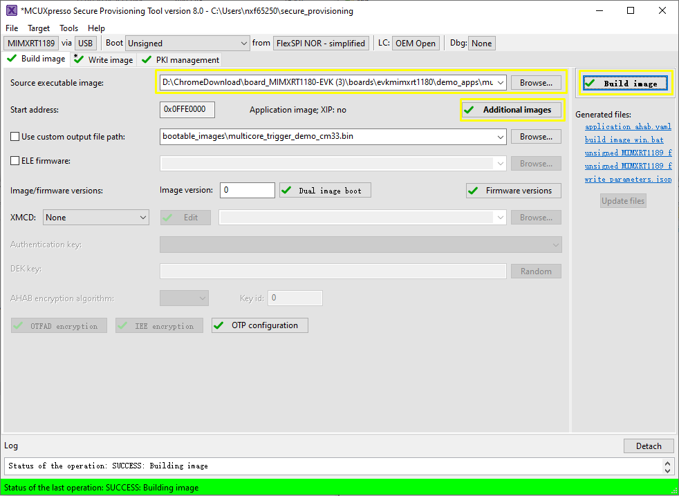 Now switch to the Write Image tab. All information is automatically generated from the previous page. Connect both USB OTG1 port (J33) and MCU-Link port (J53) to the computer and power up the board (or reset via SW3). Make sure that the EVK board boot configuration switch SW5[1..4] are on 0001 SDP mode and click Write Image.