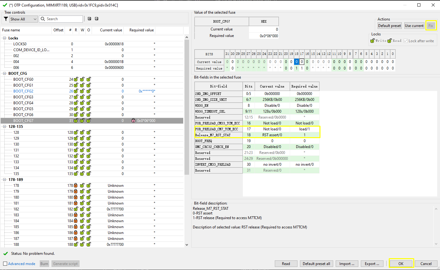 POR_PRELOAD_CM7_TCM_ECCandRELEASE_M7_RST_STATfuses inBOOT_CFG7to 1.Note: Be very careful that any setting on OTP cannot be reverted once set. There is possibility that the chip get bricked if you are fusing the wrong fuse word. Only do this if you really need to try this boot scenario.