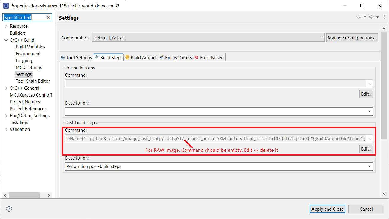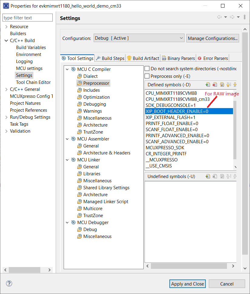 MCUxpresso settings for image type switch#