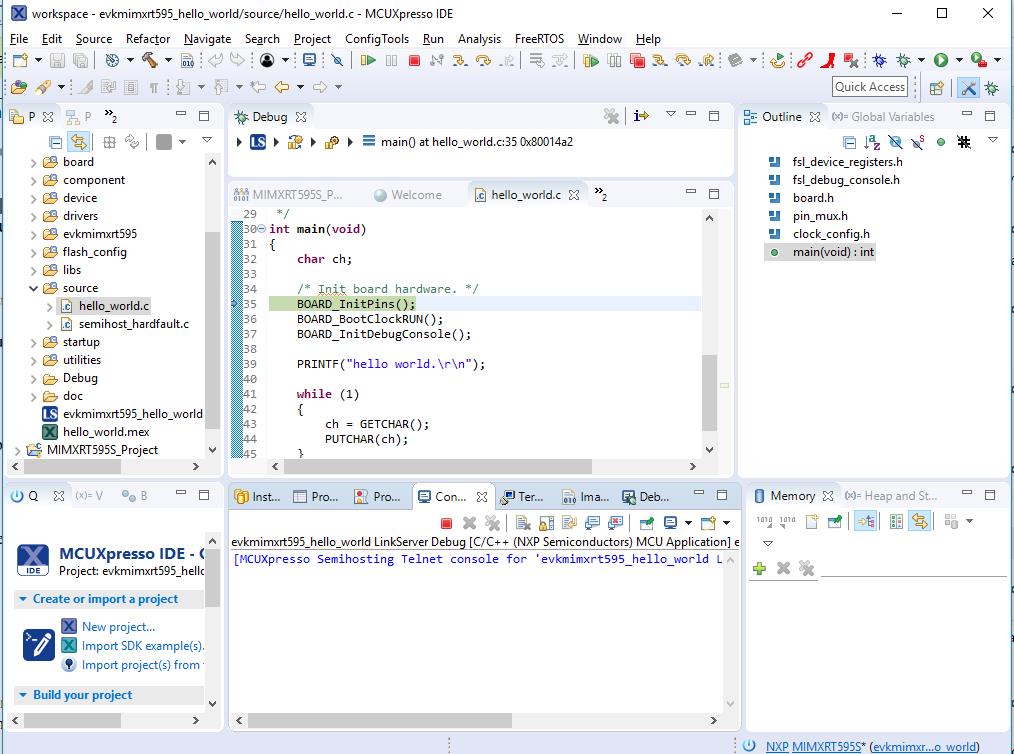This section describes the steps required to configure MCUXpresso IDE to build, run, and debug example applications. The hello_world demo application targeted for the MIMXRT595-EVK hardware platform is used as an example, though these steps can be applied to any example application in the MCUXpresso SDK.