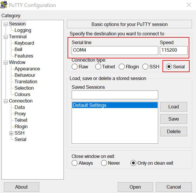 Open the terminal application on the PC, such as PuTTY or TeraTerm, and connect to the debug serial port number (to determine the COM port number, see How to determine COM port). Configure the terminal with these settings: