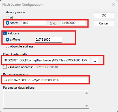 Set the memory range, relocate offset, and flashloader path.