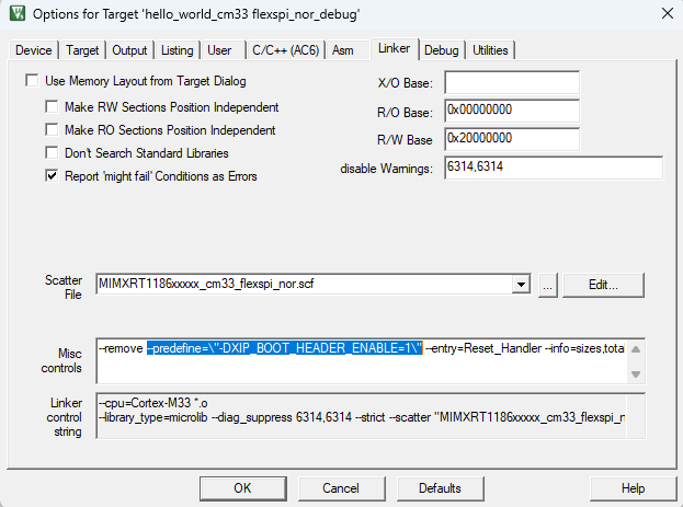 XIP_BOOT_HEADER_ENABLEin the compiler setting.For MDK, change the macro