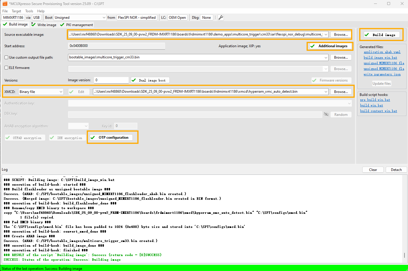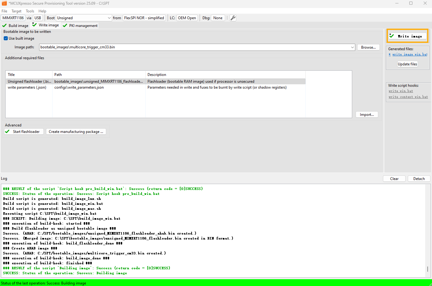 The new image constructed under Build images is still not a complete image, and the Memory Configuration Block is missing. When writing image, SPT downloads the contents of the Memory Configuration Block to FLASH.