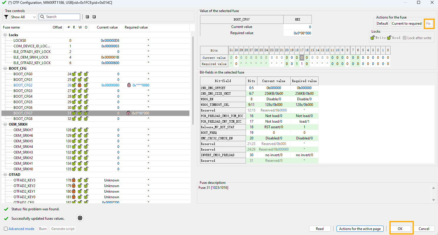 For ROM to successful copy image from flash to CM7 TCM. CM7 TCM ECC should be pre-configured. To archive this, a Fuse need to be set. Click OTP configuration, set