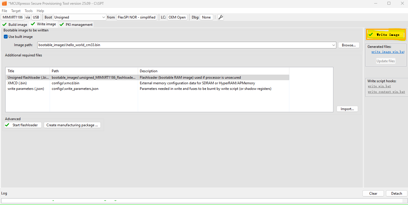 Now switch to the Write Image tab. All information is automatically generated from the previous page. Connect both USB OTG1 port (J63) and MCU-Link port (J23) to the computer and power up the board (or reset via SW2). Make sure that the FRDM board boot configuration switch J60[1..3] are on 100 SDP mode and click Write Image.