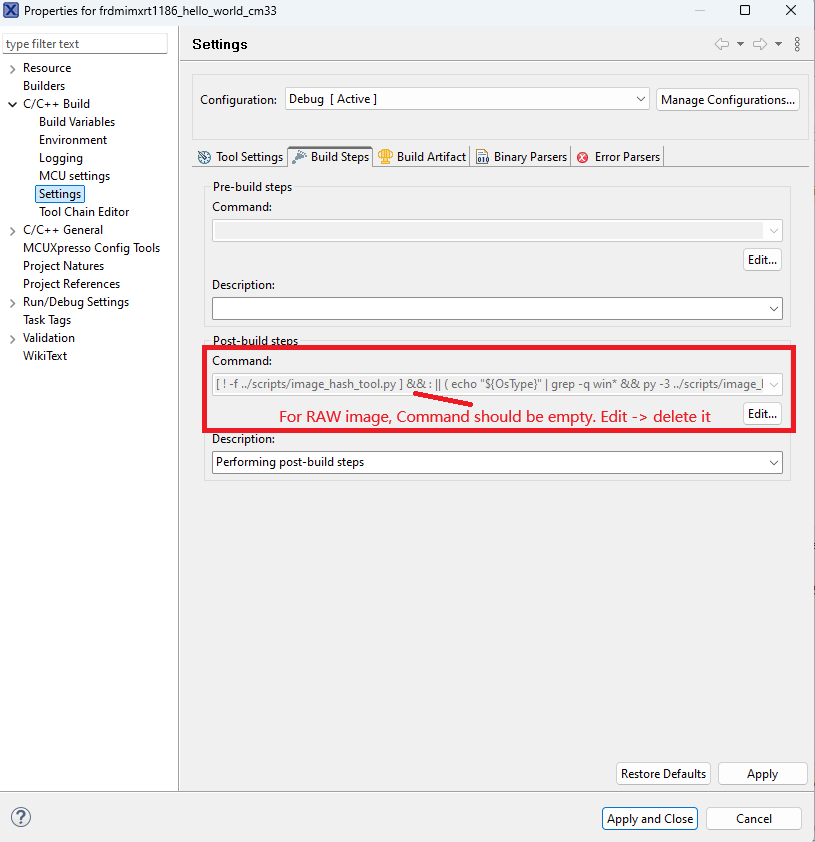 MCUxpresso settings for image type switch#