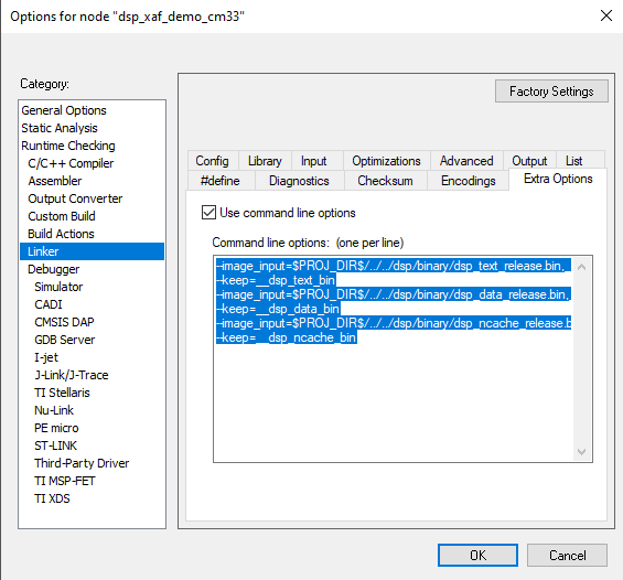 The post build scripts create the DSP images. For details, see Makefile.include in any DSP example. To reduce the image size and make image copy more efficient, they are split into SRAM part; TCM part, and uncached SRAM part. DSP images are set and linked into Cortex M33 side. For IAR, the linker is set in Project Options > Linker > Extra Options. For ArmGCC or Linux environment, set in any DSP example\cm33\incbin_gcc.S.