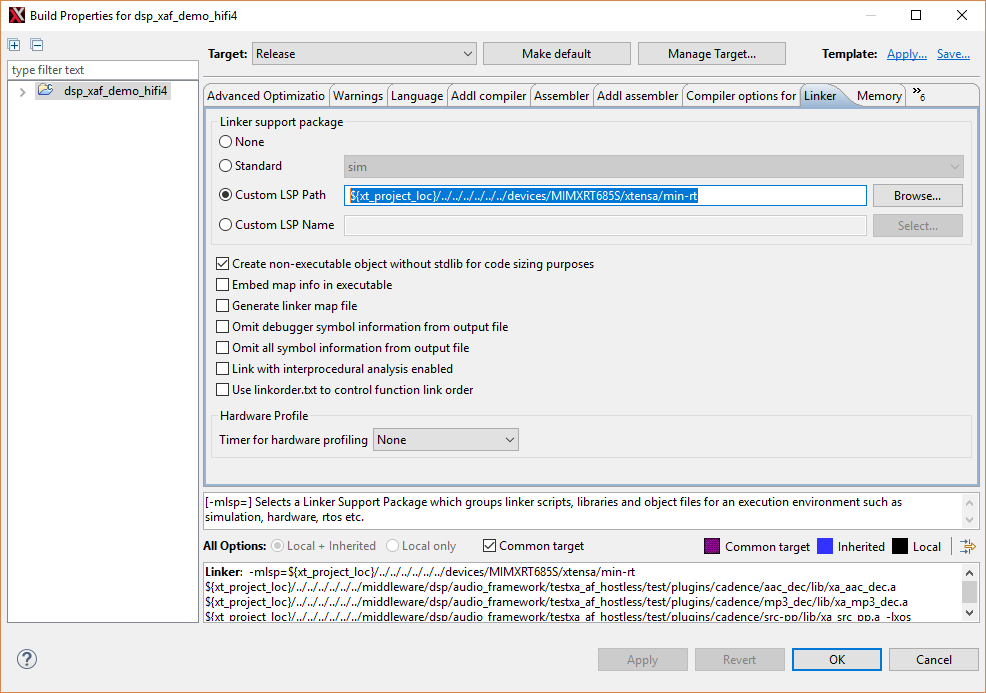 When importing the SDK DSP examples, by default the mode is set as Release. The default mode means that the images must be built in Release mode with ‘min-rt’ Linker Support Package/ LSP. To double-check, open SDK DSP examples > Build Properties > Linker.
