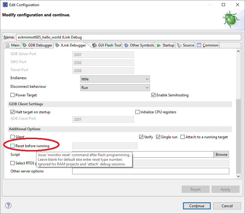 Make sure to deselect Reset before running. This helps the flash-based program get into main function.
