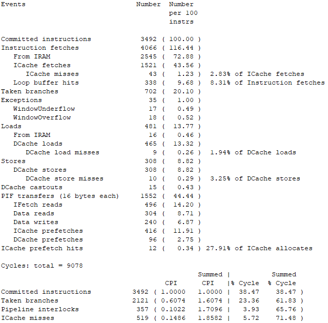 It is also common to measure exact cycle counts for specific processing/ timing measurements. The following is an example code to show how to do the cycle counts.