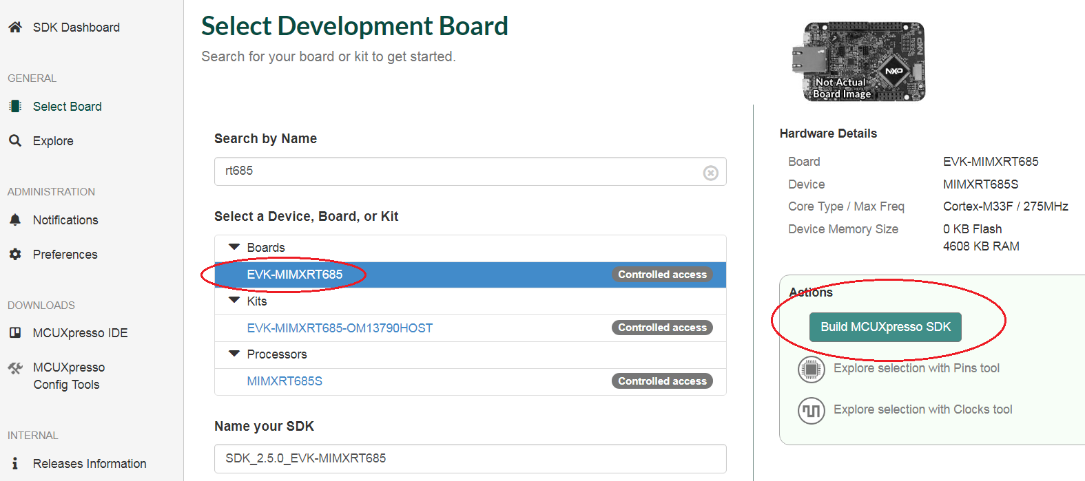 In the Build SDK for EVK-MIMXRT685 page, select the required environment settings.