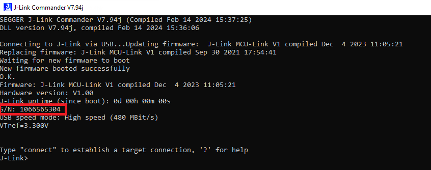 Note: It is mandatory to replace the ‘usbser’ section with the J-Link serial number on the back of the J-Link hardware in use.
