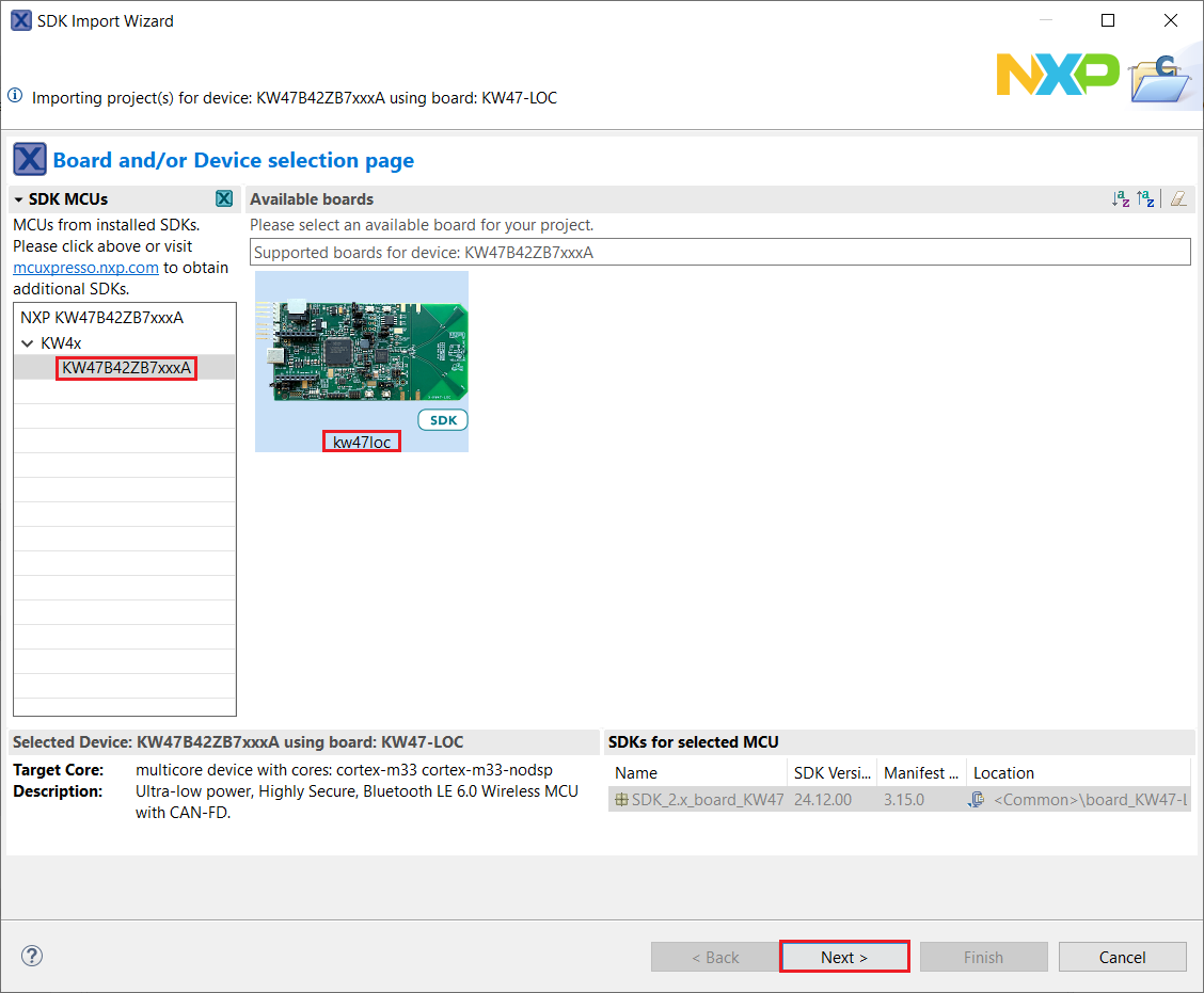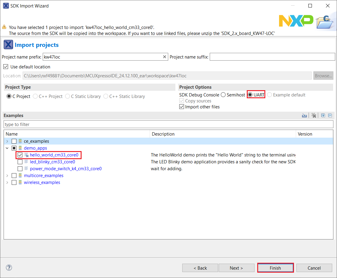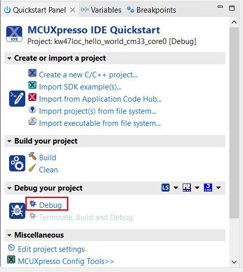 This section describes the steps required to configure MCUXpresso IDE to build, run, and debug example applications. The hello_world demo application targeted for the KW47-LOC hardware platform is used as an example, though these steps can be applied to any example application in the MCUXpresso SDK.