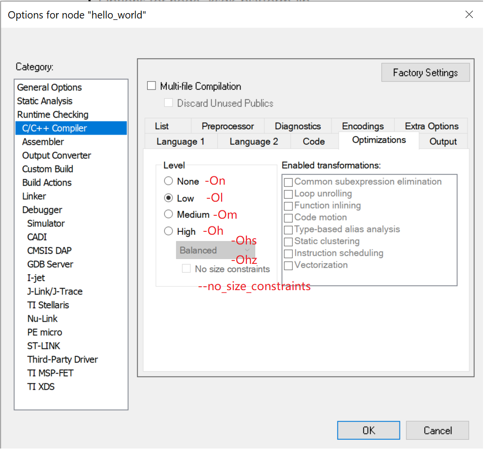 IAR supported compiler optimization flags are: