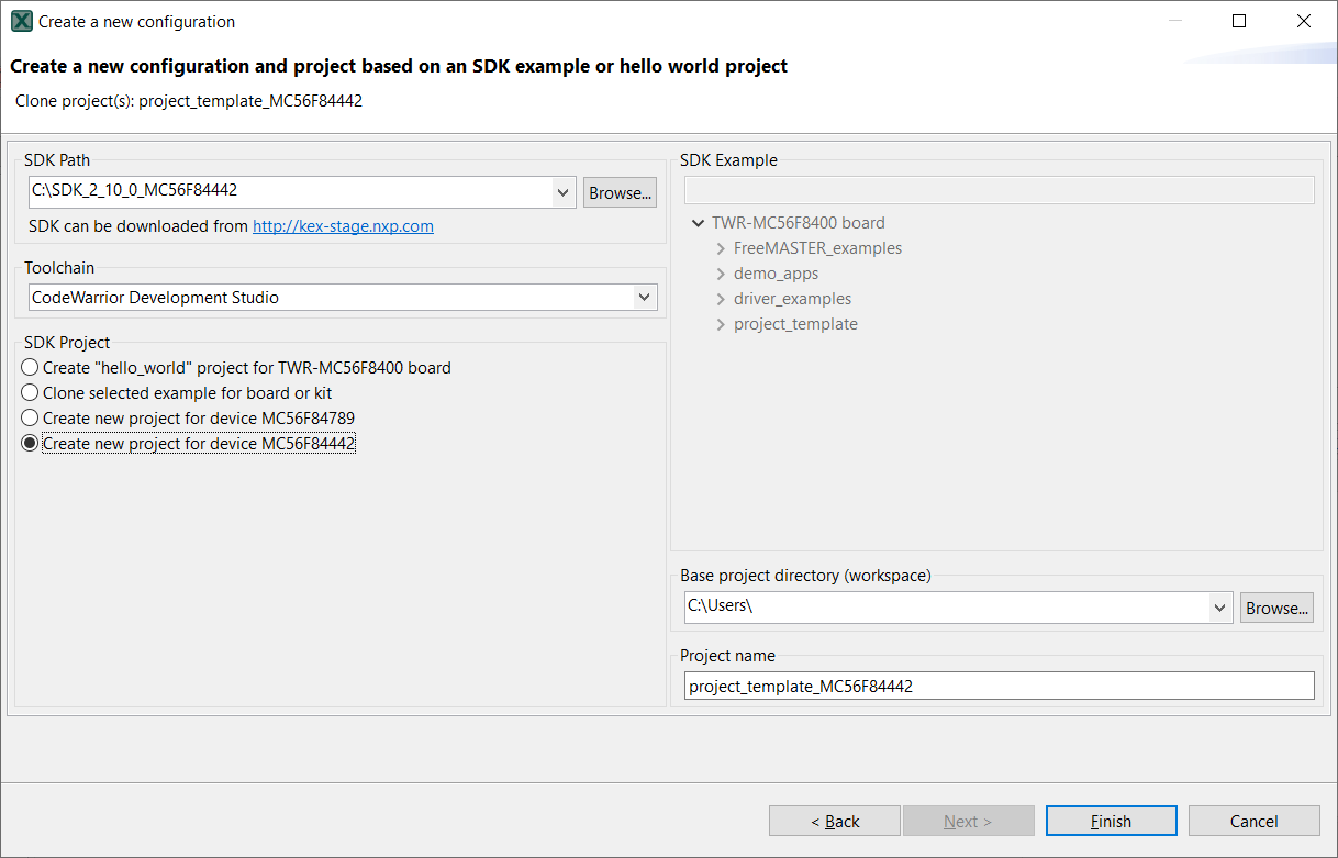 project_template_{part_number}. User could modify the default name in Project name textbox.All peripheral drivers files are included in the generated project_template project. They are same as the peripheral drivers within SDK package. If some drivers are not used or required, users may delete them in CodeWarrior, or delete them directly under folder ${project_path}/drivers.
