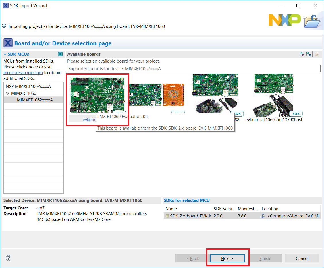 Select the evkmimxrt1060 board and click the Next button to select the desired example(s).