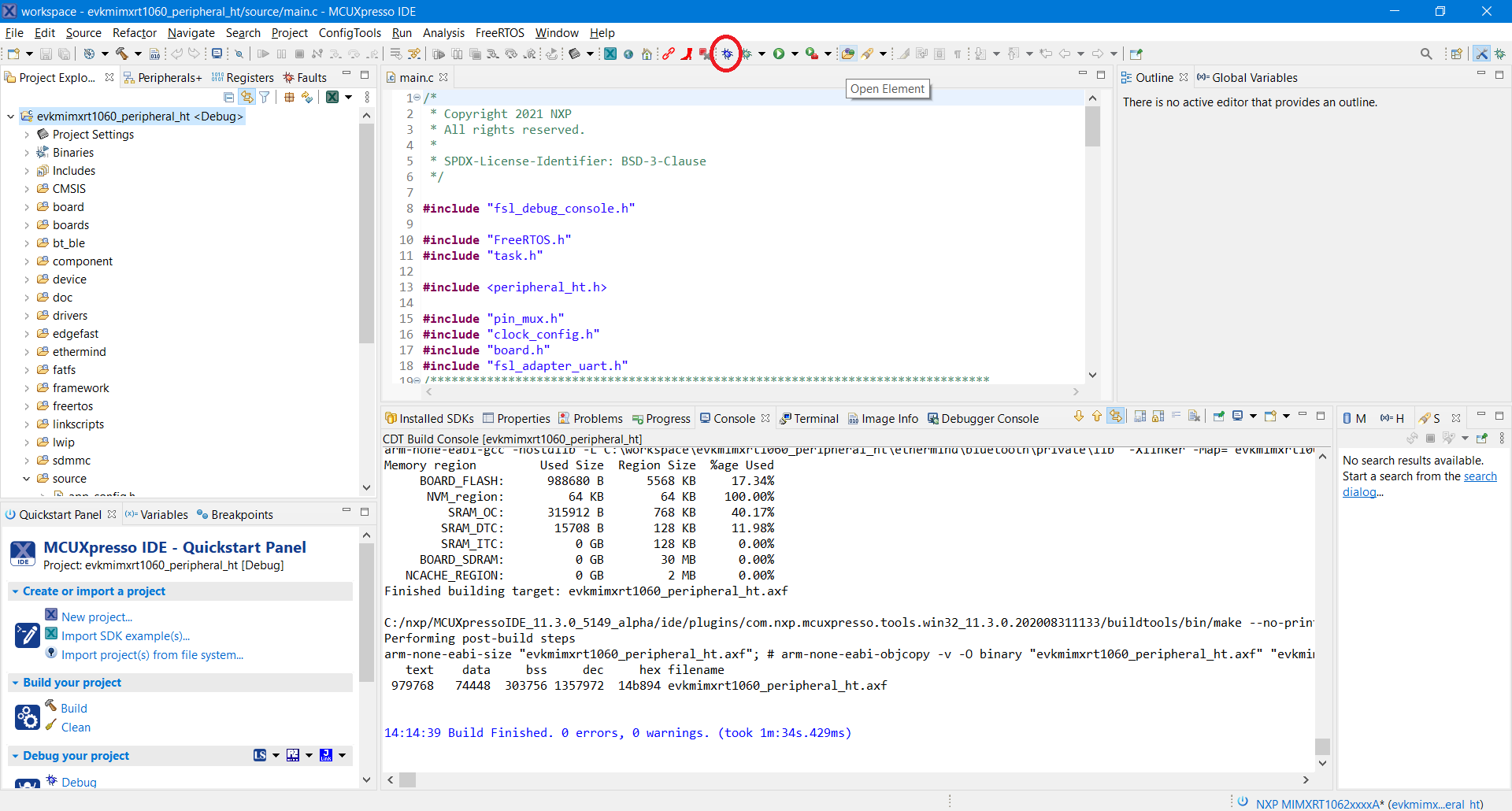 This document uses peripheral_ht example to describe the steps to open a project, build an example, and run a project on MCUXpresso IDE.
