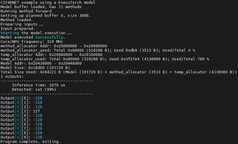 After building the example application and downloading it to the target, the execution stops in the main function. When the execution resumes, an output message displays on the connected terminal. The output of the executorch_cifarnet example will be the same as the output shown above for the ARM GCC toolchain.
