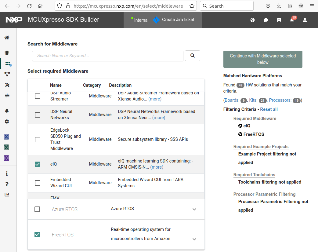 To include eIQ Media Processing Pipeline into the MCUXpresso SDK package, select both “eIQ” and “FreeRTOS” in the software component selector on the SDK Builder page.