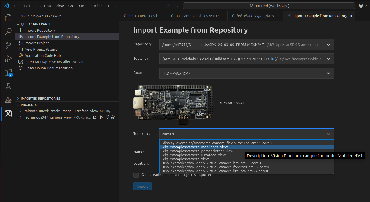 When using Visual Studio Code IDE, the example applications can be imported through the MCUXpresso plugin in Quickstart Panel > Import Example from Repository as shown in Figure 2.