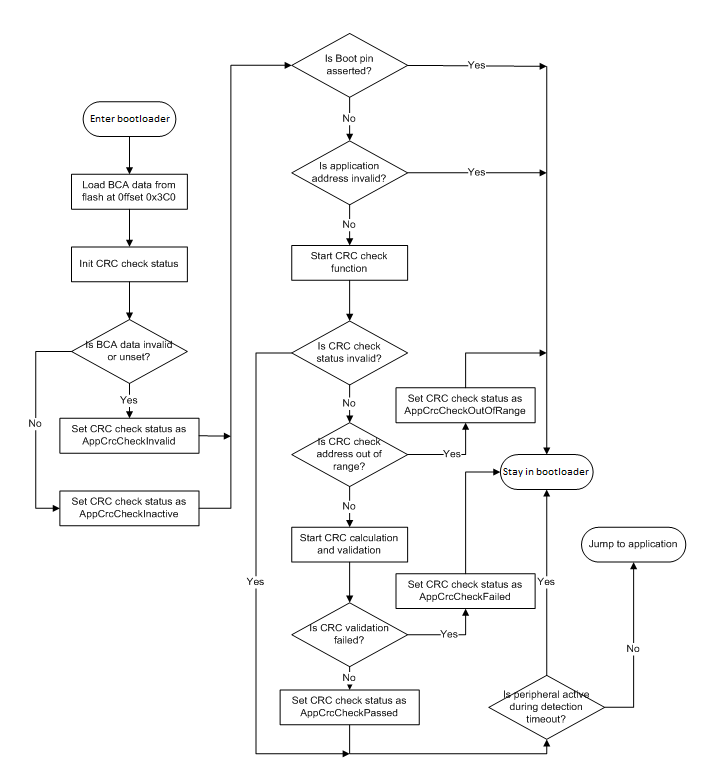 If a boot pin is not asserted and application address is a valid address (the address is not null, the address resides in a valid executable memory range, and the flash is not blank), then the bootloader begins the CRC check function. Otherwise, the CRC check function is bypassed.