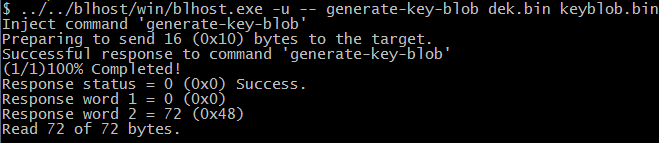 After the command, “blhost.exe -u –generate-key-blob dek.bin keyblob.bin” in figure above is executed, a “keyblob.bin” file gets generated.